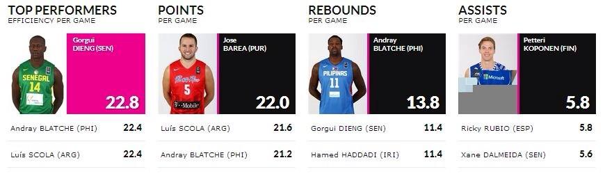 El jugador con mejor eficiencia por partido ha sido Gorgui Dieng, de Senegal. El pívot de los Timberwolves se ha erigido como un malsueño para sus rivales por su potencia física y su capacidad para atraer todos sus rebotes a sus manos. Sorprende ver que en el Top 3 de ese ránking encontramos dos jugadores interiores más: Blatche, líder indiscutible de Filipinas y un Luis Scola que sigue mandando en Argentina.