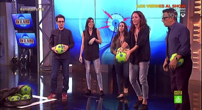 Laia Palau, Silvia Domínguez y Anna Cruz, tres jugadoras de la selección de baloncesto española, visitaron el plató de En el aire para contar su hazaña en el mundial de Turquía. Así confesaron lo importante que es para ellas cantar una serie de canciones antes de salir a jugar y cómo se desestresan jugando al fútbol. Berto y Buenafuente les propusieron hacer un nuevo deporte en directo: el 'footbasket'. Y éste fue el resultado: